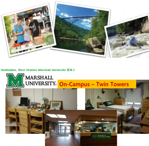 마샬 대학교 MU(Marshell University)는 1837년 설립되어1961년에 대학으로써 승격된 4년제 주립대학교입니다. 미국의 네 번째 대법원장인 John Marshall의 이름을 따서 학교명의 Marshall University로 정하게 되었습니다. 현재 약 50개국에서 모인 400명 이상의 유학생을 포함한 약 15,000명의 학생들이 공부하고 있으며 660명의 교직원이 근무하고 있습니다.마샬대학교는 웨스트 버지니아(West Verginia)의 작고 안전한 도시인 헌팅턴(Huntington)에 위치하고 있습니다